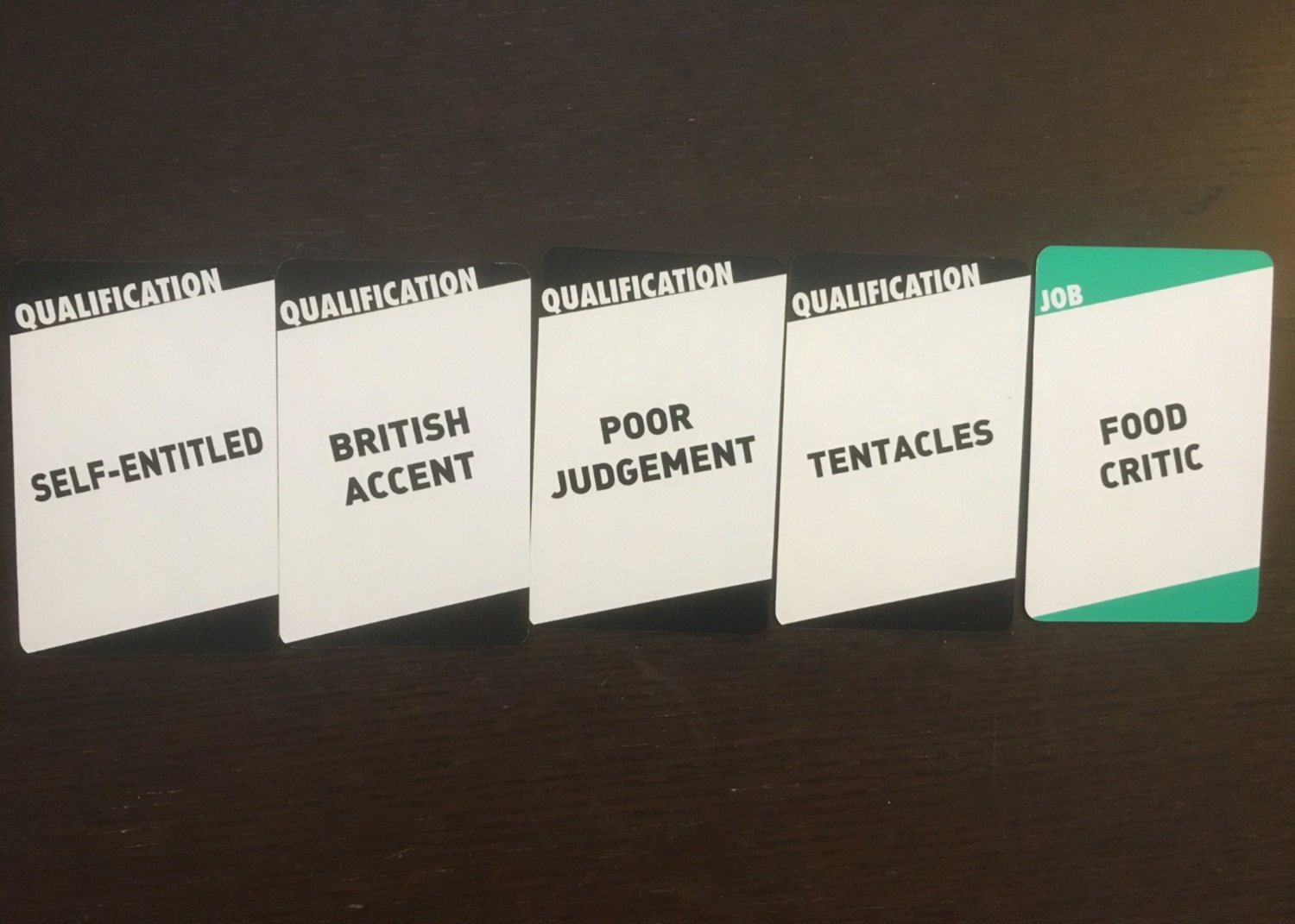 It is a game for all ages that transforms the traditional interview process into a satirical, ridiculously fun card game. Using wild qualifications such as “soft hands” and “self-entitled”, players use their improvisational skills to weave a set of unrelated characteristics into a cohesive narrative explaining why they’d be good for a job.